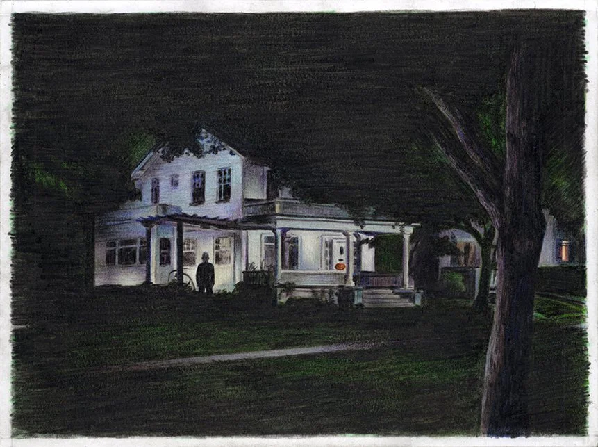 During the month of October I had several pieces on display in the Ithaca Print Commons in Ithaca, NY for the 8th annual Open Season group show. Since the theme was hunting and it was during spooky season I decided to draw 3 scenes of The Shape aka Michael Myers, stalking Jamie Lee Curtis’s character, Laurie Strode. These were all done with my new favorite medium to work in: watercolor pencil. I hardly ever dilute them with any water but just enjoy drawing with them. Probably should just go to regular colored pencils but I’ll wait until I grind all of these watercolor pencils down to a nub.