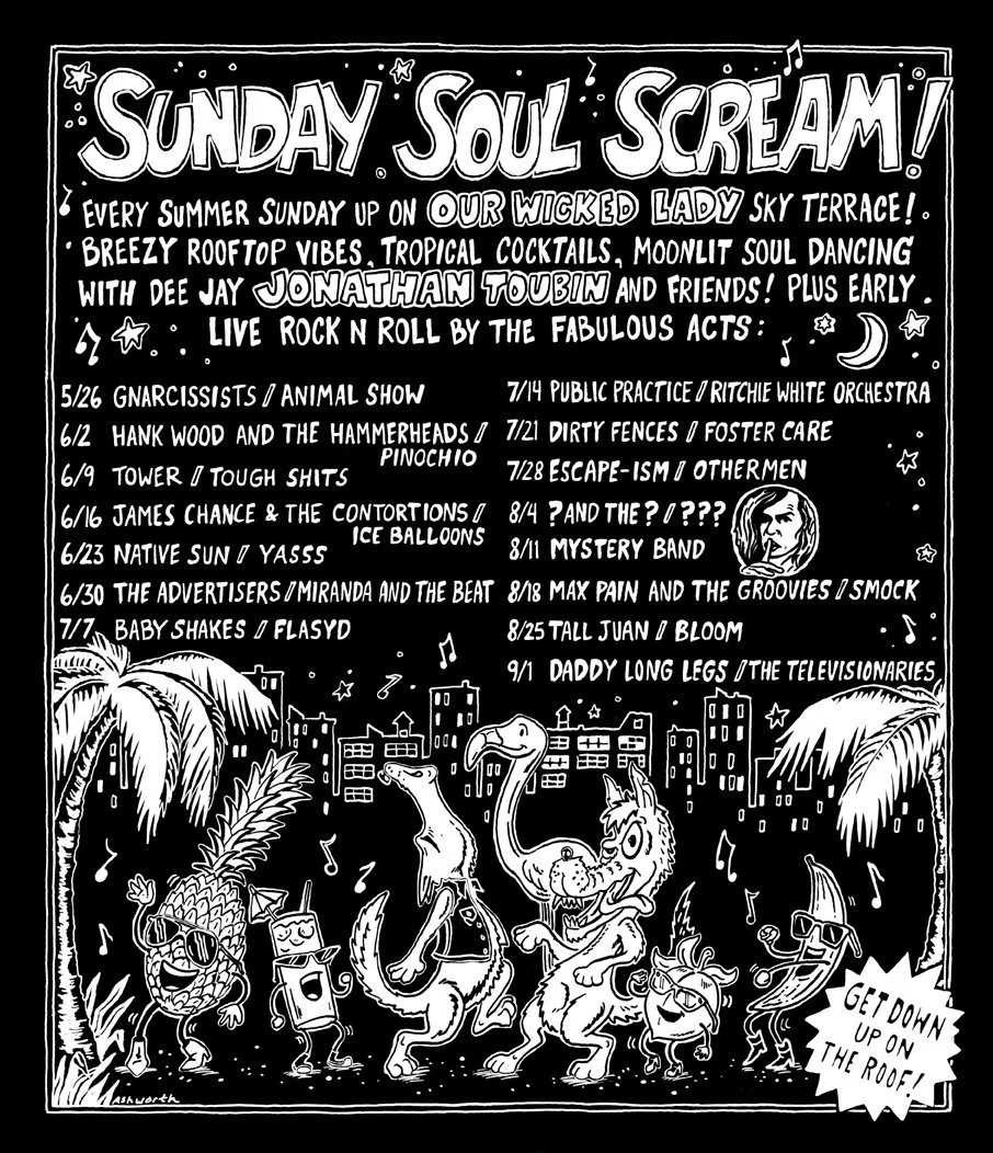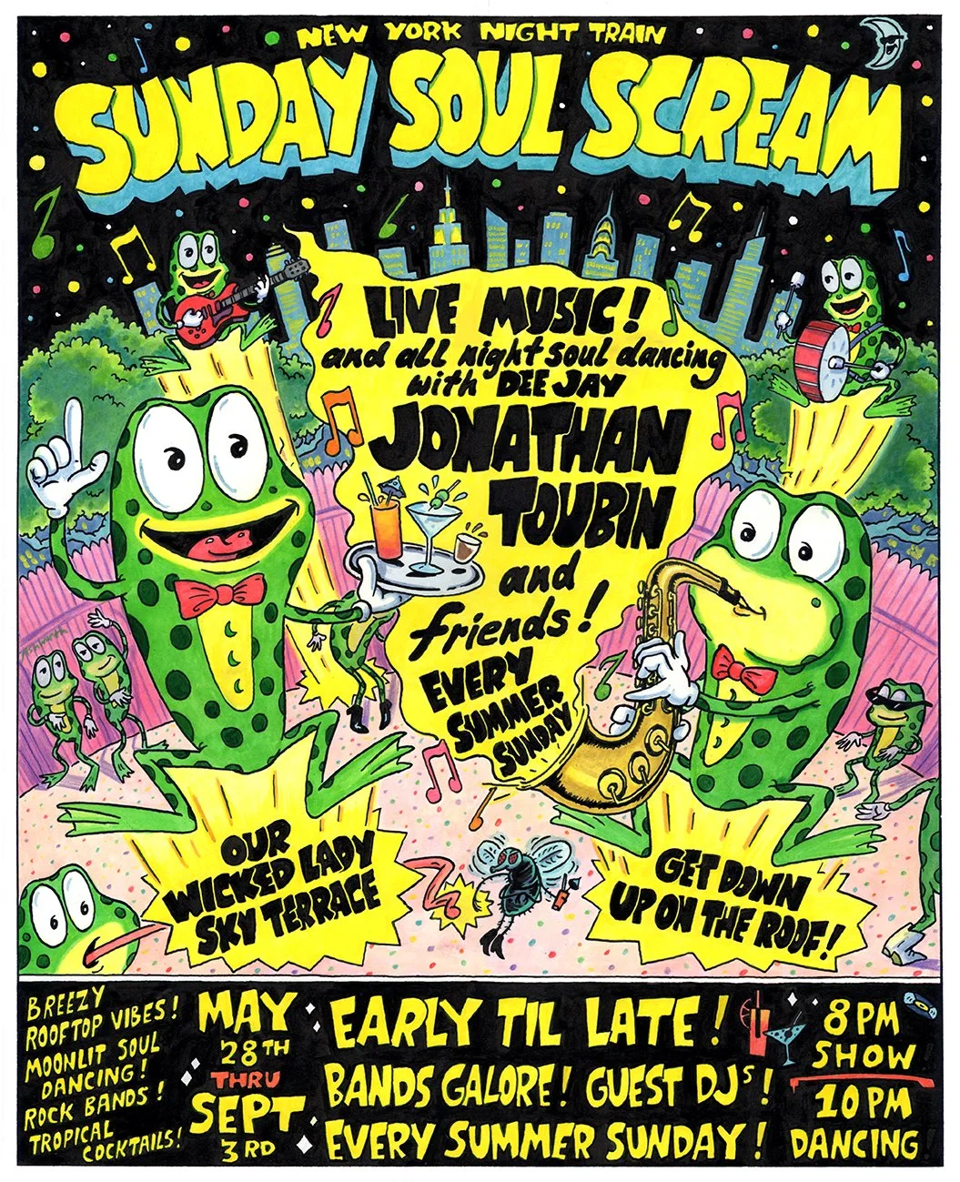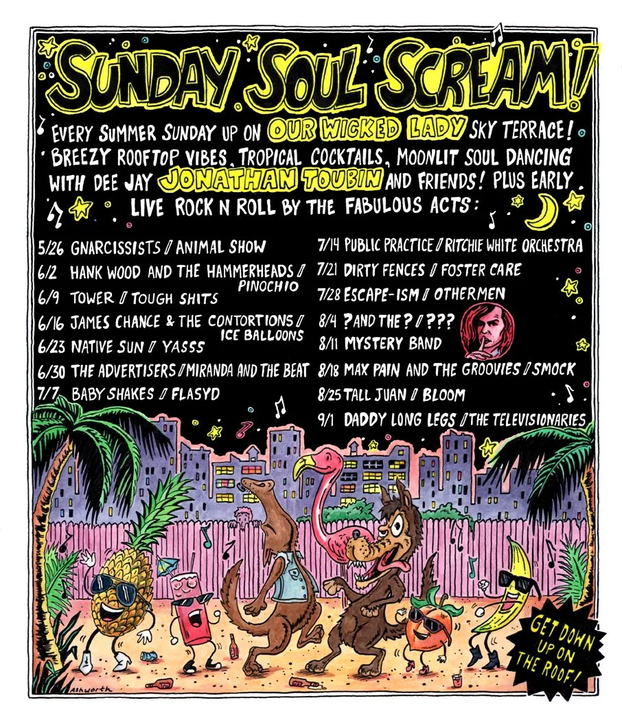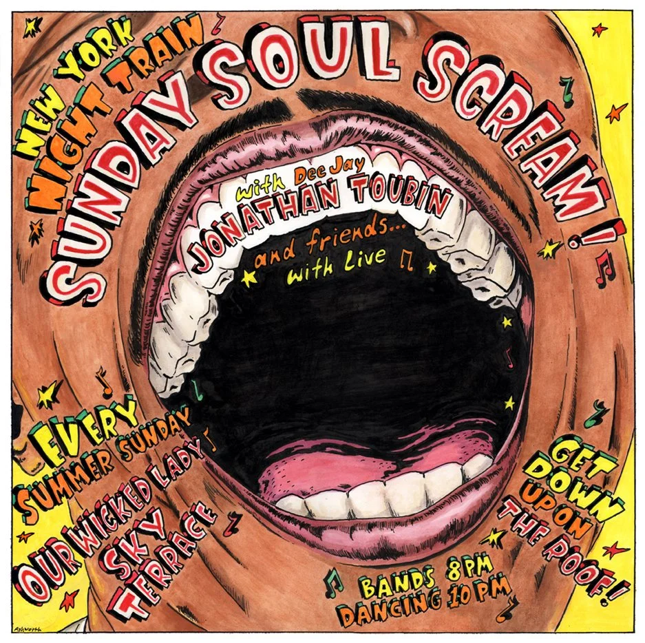 The above poster and the one directly below, from Jonathan Toubin’s Summer 2024 Sunday Soul Scream, are the final posters I made for OWL. Jonathan had his summer residency going for a couple years before I jumped in to help with the visuals for the promotional material and merchandise and we kept it going from 2019-2024, only missing summer 2020 due to the covid-19 pandemic. After hearing the news about the upcoming closure of OWL I took a little spin through the work I had done for them and Jonathan and thought it’d be nice to lay it all out here as a little farewell note. Had a lot of fun with these over the years. They had their own energy outside of the NY Night Train stuff I made with Jonathan and we got to make some of them into these sort of “tour” t-shirts every couple of years which was cool to see. Anyways, I’m gonna miss the place and hanging out on that rooftop on summer nights. Scroll down and check out some of the Soul Scream and non-Soul Scream illustration work I did for OWL events below.