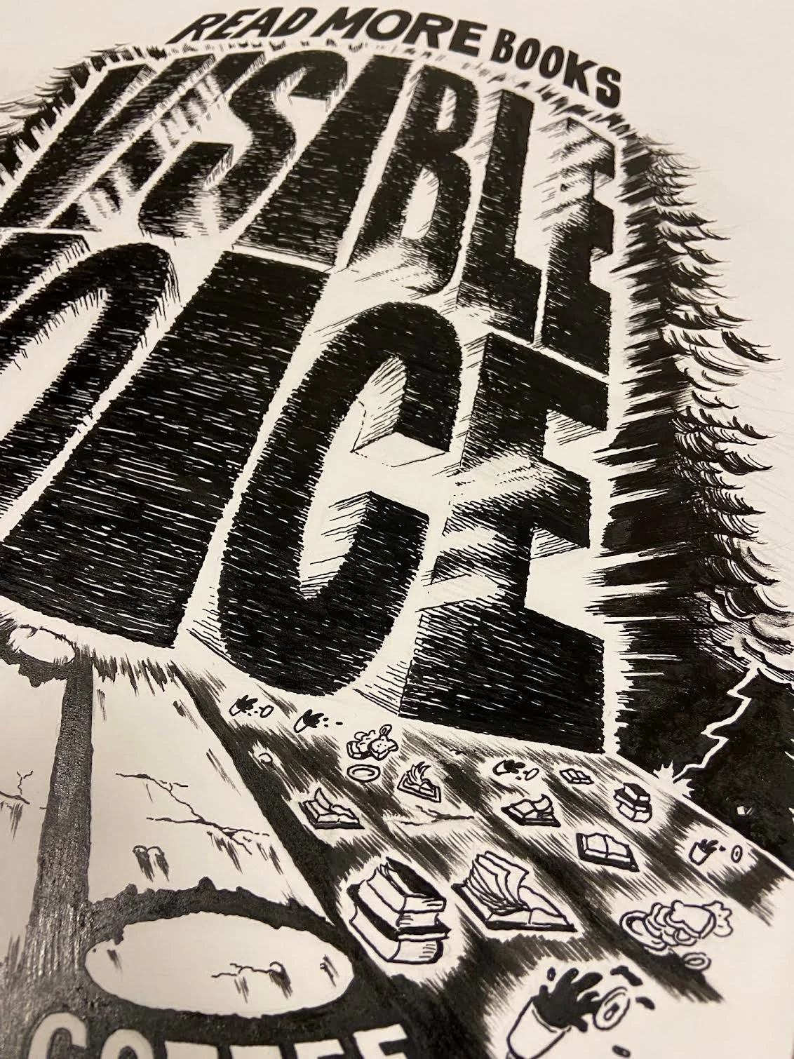 New ink work for Visible Voice Books in Cleveland, OH. The store recently moved and did an amazing build out at the new location which includes, along with a performance space, a cafe, hence the “drink more coffee”. My illustration has been slapped on some tees, totes and mugs and, in a career-first, I got some of my work on a doormat. A big thanks to my buddy Trey, for including me in this huge project! If you live in and around the Cleveland area I encourage you to check out the amazing new location. I know I’d frequent this spot if I lived near it.